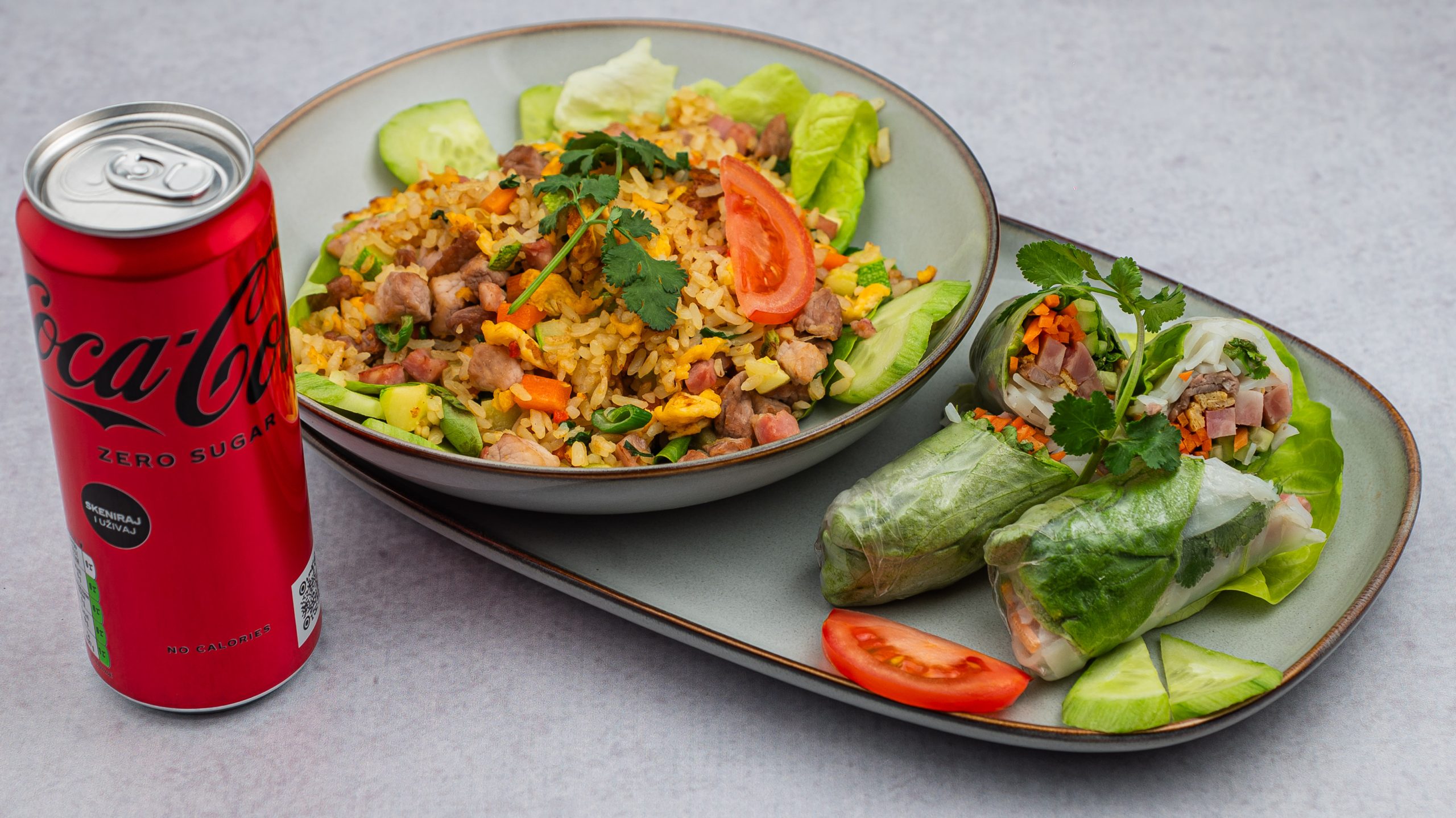 Prženi pirinač sa mesom + 2 prolećne rolnice + piće po izboru